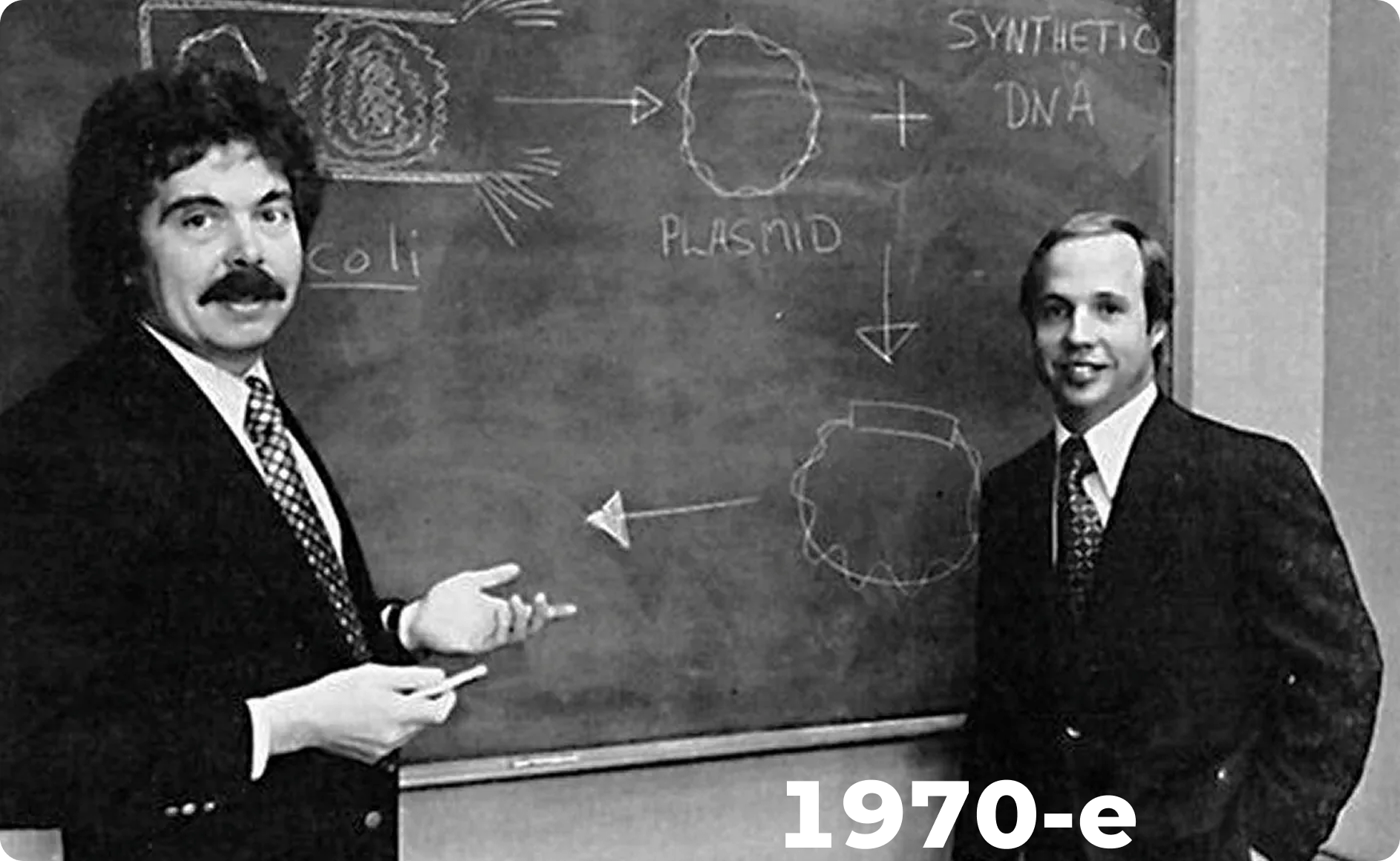 1970-е — начало развития генной инженерии: учёные из США создали первую рекомбинантную ДНК (то есть ДНК с такой генетической последовательностью, которой ранее никогда не было в природе).